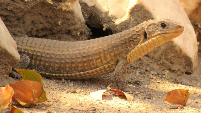 One can imagine how astounded I was that this plated dragon, who usually slides back into the darkness of his cave if I approach, stretched up to accept my offer! Needless to say, it hasn’t happened again and so, instead, I leave fruit on a rock at his entrance and I hope the rains will soon come, bringing millipedes and frogs and insects and a more varied diet for him.