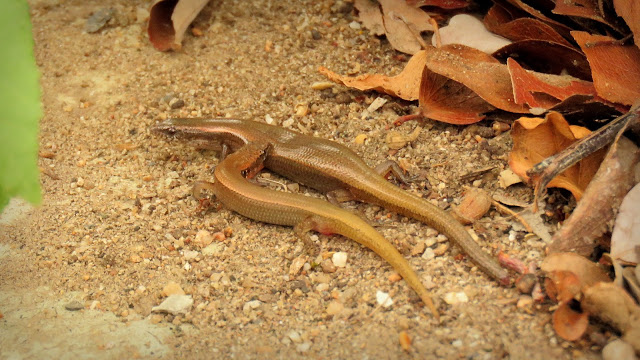 I managed a hurried photo and turned away, not having the heart to make any sudden movements that would spoil the moment or disturb them. I looked over my shoulder a few moments later and saw that they had soon changed positions and were indeed making baby skinks and I felt that the only way to record the moment would be to use this keyboard. As I sit and type, they dive in and out of their own little utopia, as bronzed as the drying Mopane leaves that make up the sea that they live in.