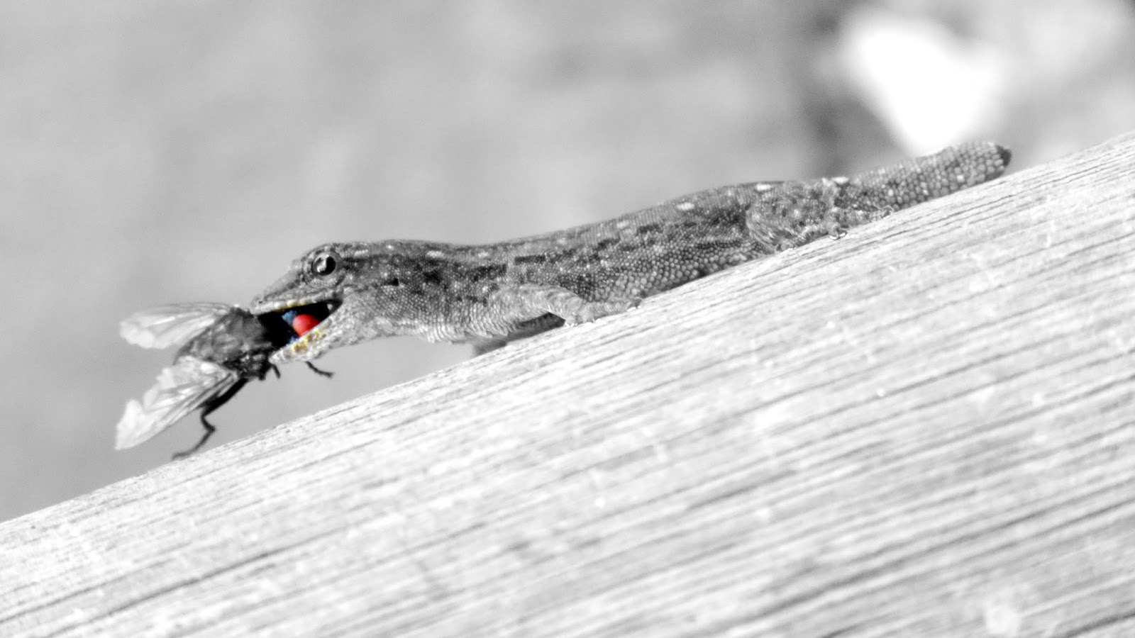 After this ordeal, she rarely visited the table, spending her time on a makeshift pole bench that has been at the door since the bungalow was built sometime in the middle of the last century. We occasionally saw her there and there were no more tea parties but if a fly interrupted the morning game of gin and we could catch it, it became more imperative to give her a treat since I believed she was going to be laying eggs pretty soon. The tail stub began to grow and instead of a blunt and red end to her stump, a little pointy protuberance began to show.
