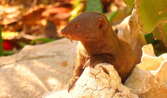 A Mopane Grove mongoose lies in the shadow of the curved arm of a Candelabra Euphorbia, the scene dappled in sunlight and rustic hues. The shadows contrast with the whiteness of her throne and her elbow rests on the crest of the ageing and flaking cervical vertebra of an ele who died a long time ago. She wears the latest in mongoose fashion accessories, a fake canine, looking every bit the false sabre-tooth that her temperament may show her to be.